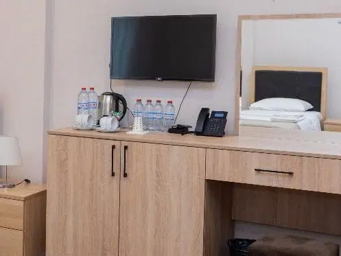 Tea set (tea, coffee, sugar, and kettle) and bottled water are available in each room.
